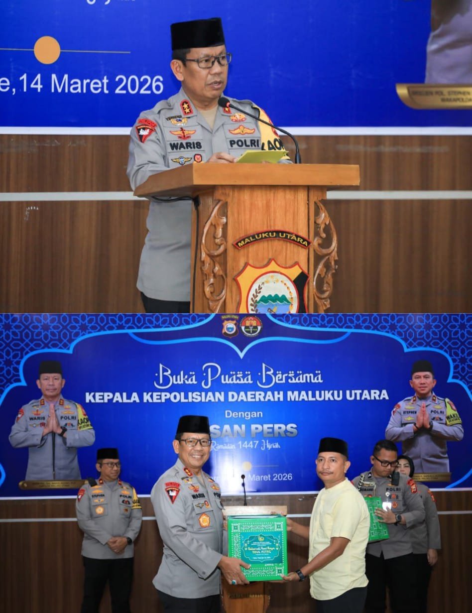 TERNATE – Suasana hangat dan penuh keakraban menyelimuti kegiatan buka puasa bersama yang digelar oleh Kapolda Maluku Utara bersama insan pers di Aula Polres Ternate, Sabtu (14/3/2026). Kegiatan di bulan suci Ramadan ini tidak hanya menjadi momen berbagi kebahagiaan, tetapi juga momentum strategis untuk mempererat tali silaturahmi antara jajaran kepolisian dengan para jurnalis yang selama ini menjadi mitra dalam menyampaikan informasi kepada masyarakat.